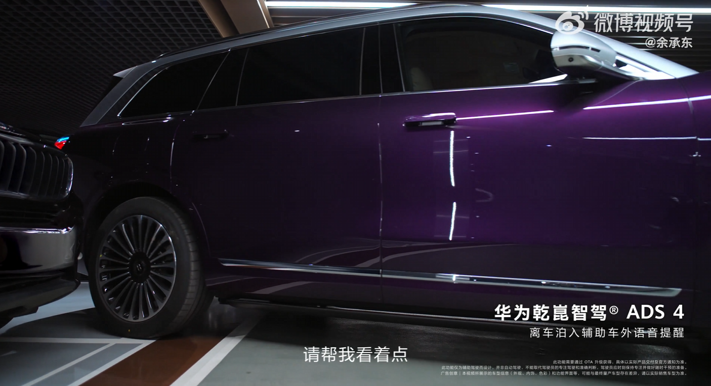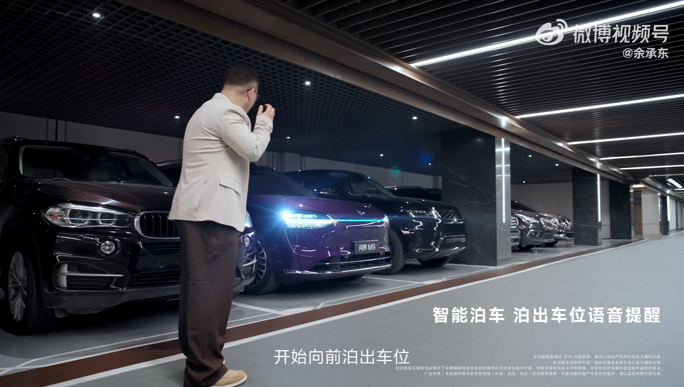 从余承东分享的视频可以看到,问界 M9 汽车的泊车车外语音功能可搭配华为乾崑智驾 ADS 4 的车位到车位领航辅助功能使用,支持离车泊入辅助车外语音提醒。